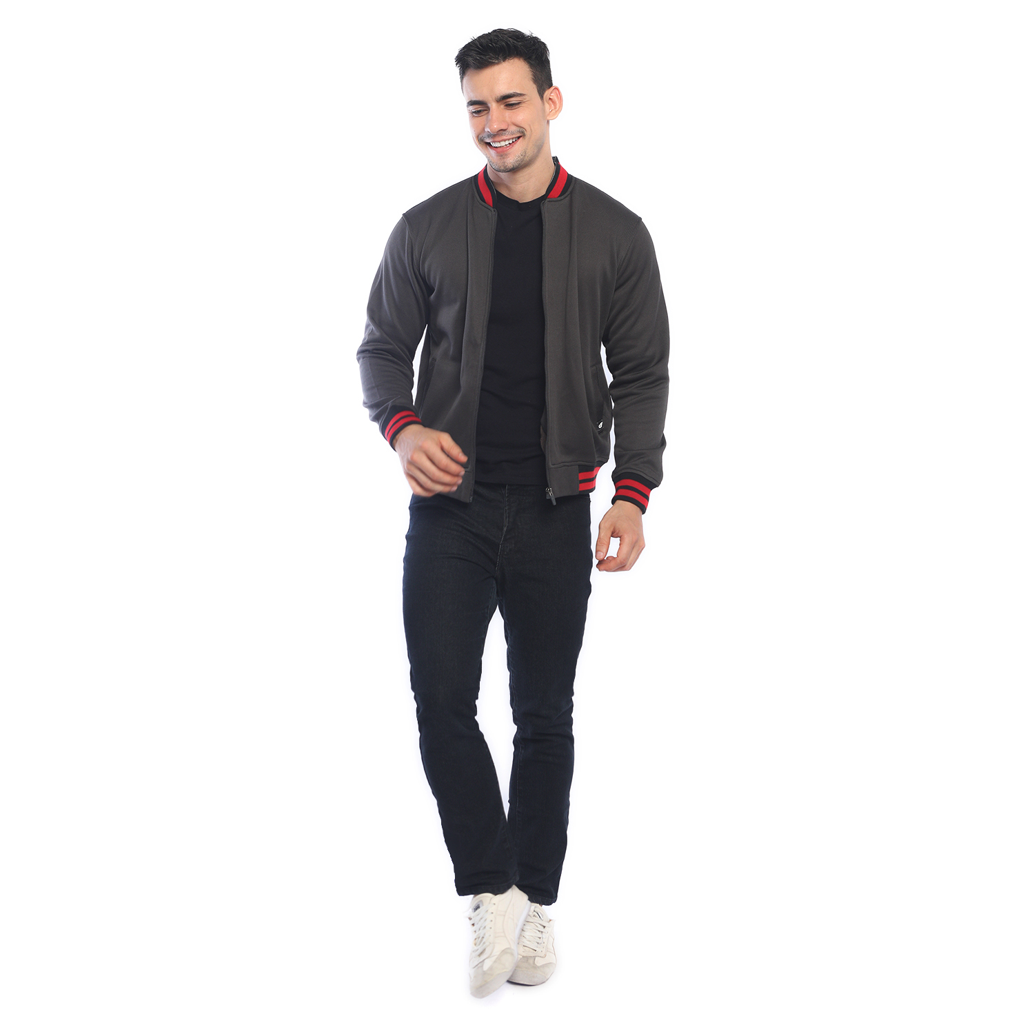 – Jaket bomber detail motif garis bergaya kasual