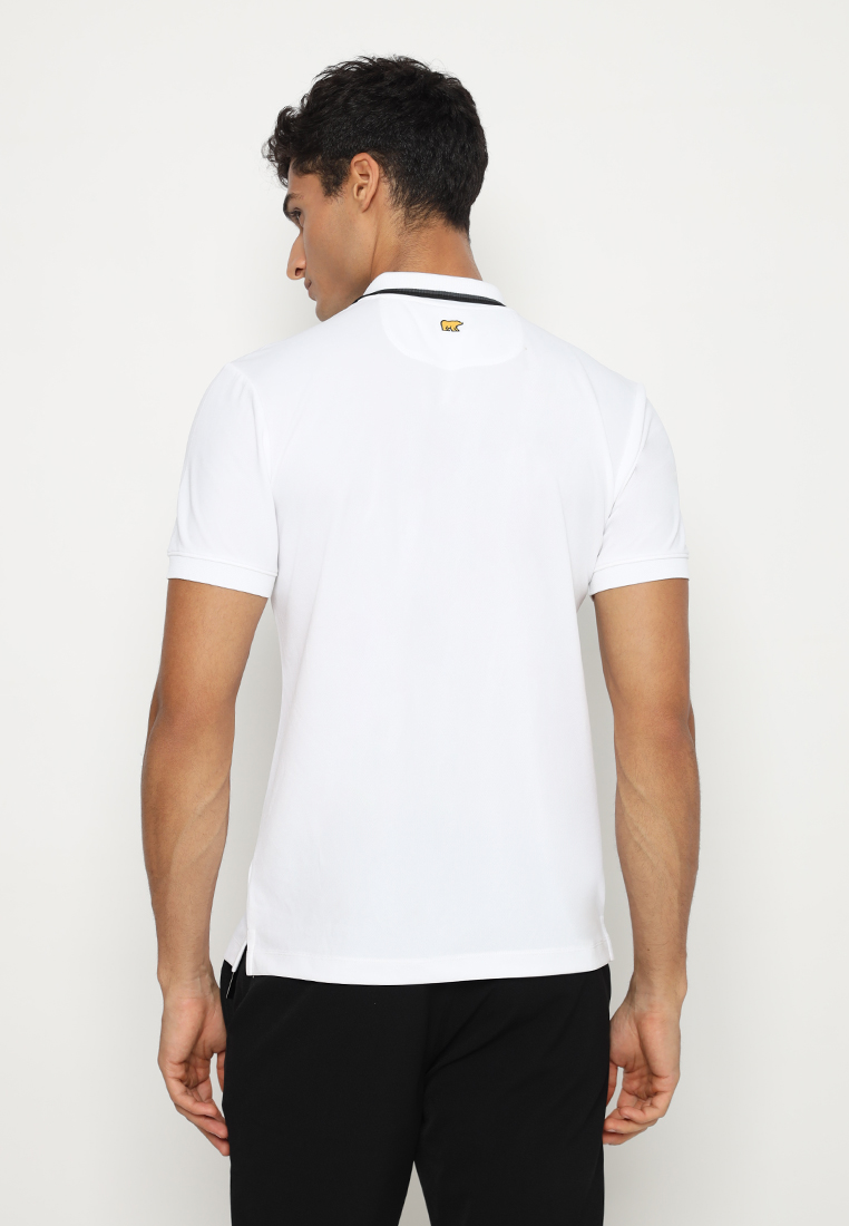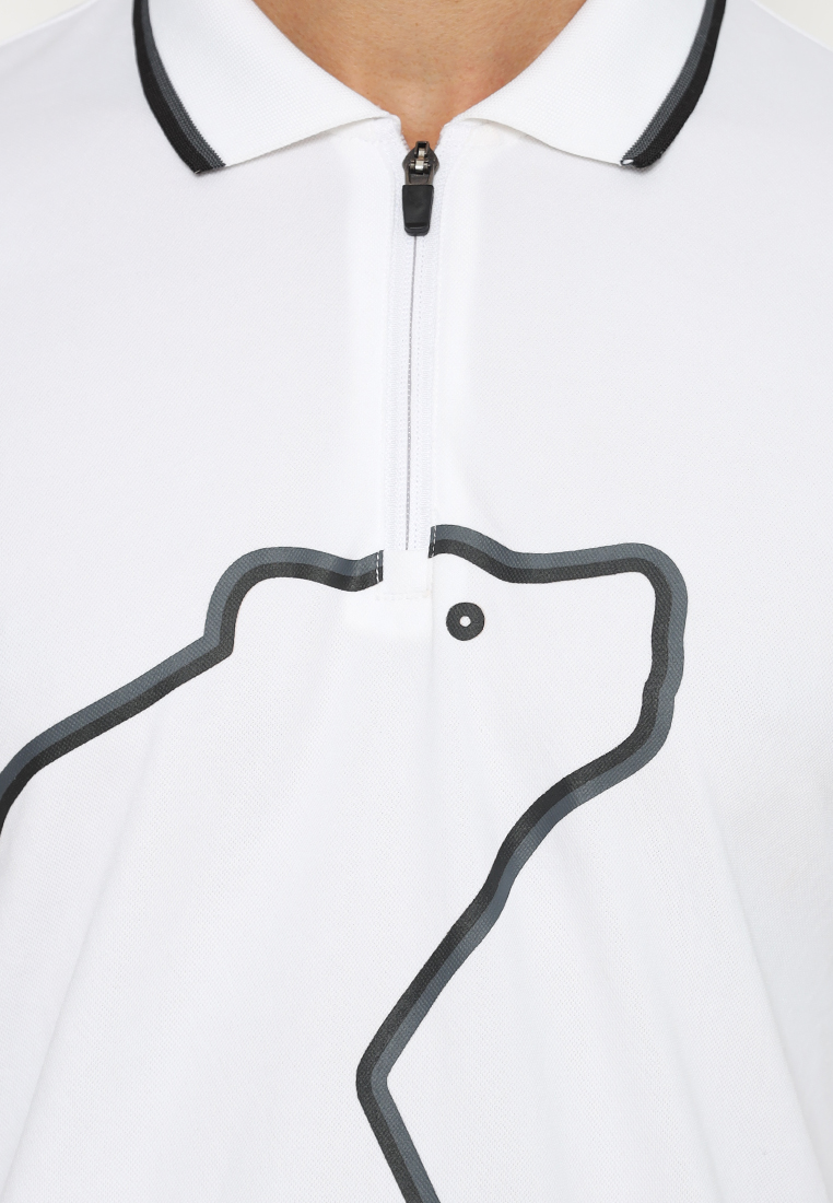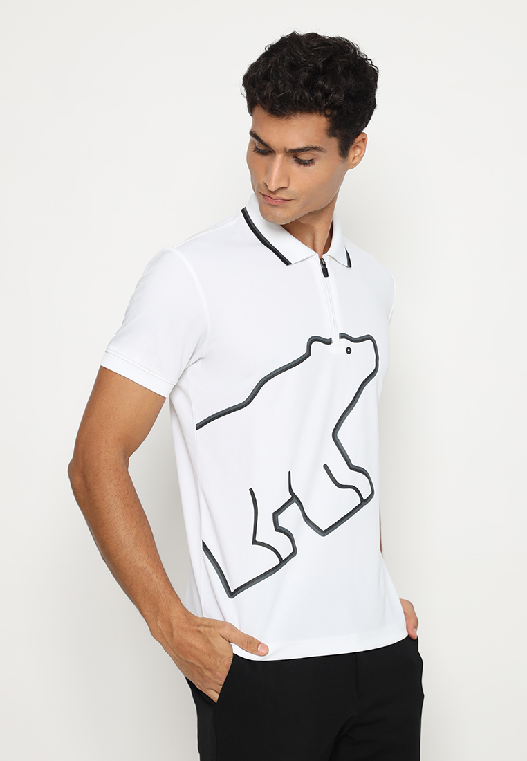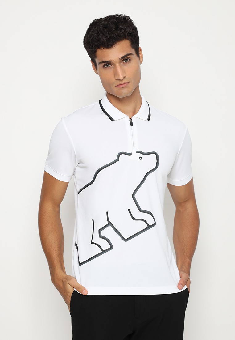 Polo Shirt lengan pendek Jack Nicklaus didesign dengan Zipper Placket, Flat Knit (Rib) Kerah dengan aksen 2 Tipping kontras, Flat Knit (Rib) Cuff (Manset), Printing 2 Outline (Garis terluar) Golden Bear di bagian depan, Golden Bear embroidery warna benang Gold dengan outline memakai warna benang hitam di back yoke, Ujung Polo dibuat lurus, dan 2 Bukaan samping di ujung polo (kiri dan kanan).