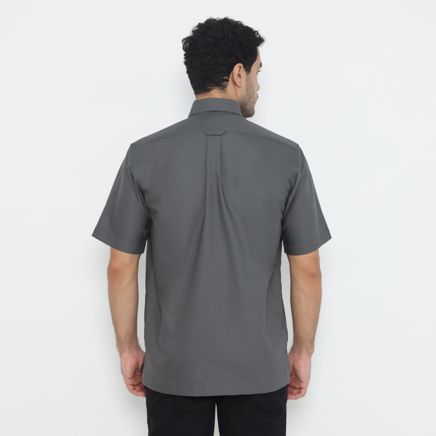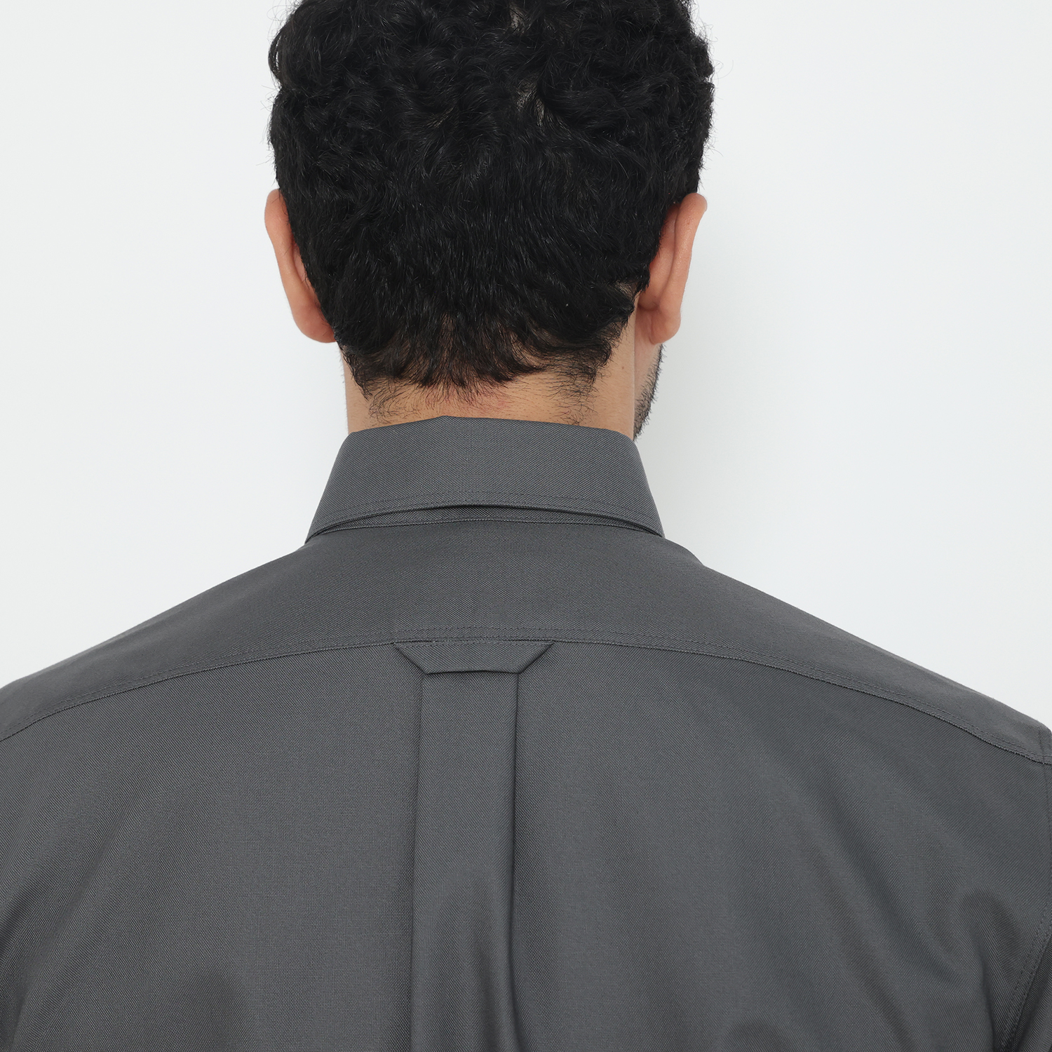Tampilan klasik diperkuat oleh button-down collar, placket dengan kancing terlihat, serta ujung bawah kemeja lurus dengan bukaan samping (side slit) untuk memberikan fleksibilitas dan gaya kasual yang modern. Bagian belakang menampilkan back yoke dengan pleats di tengah, memberikan ruang gerak yang lebih nyaman, serta hanging loop sebagai ciri khas desain fungsional Jack Nicklaus.