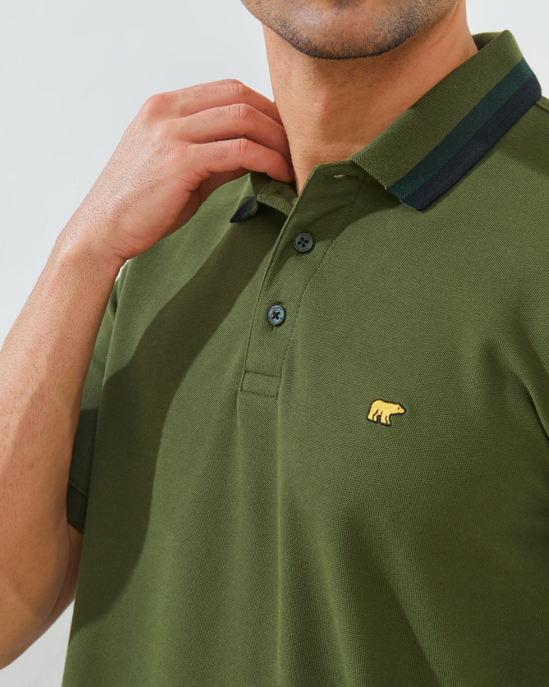 Detail rib collar tipping dua warna (2 Color Block) menciptakan kesan dinamis, sementara bordir Golden Bear Classic di dada kiri menjadi simbol eksklusivitas dan prestise khas Jack Nicklaus.