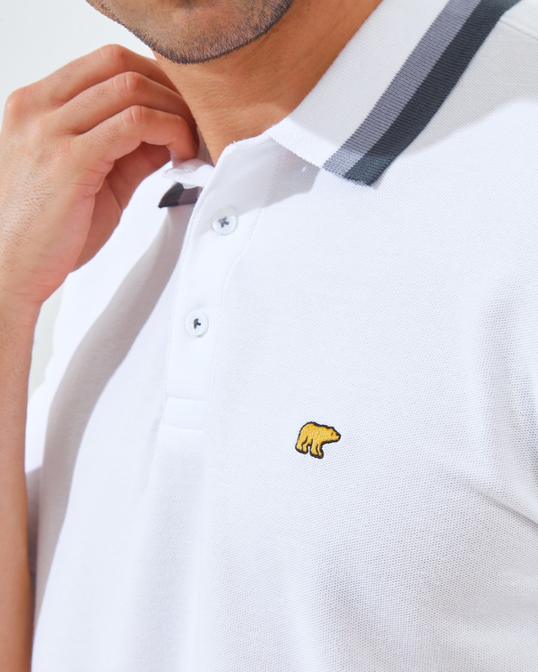 Detail rib collar tipping dua warna (2 Color Block) menciptakan kesan dinamis, sementara bordir Golden Bear Classic di dada kiri menjadi simbol eksklusivitas dan prestise khas Jack Nicklaus.