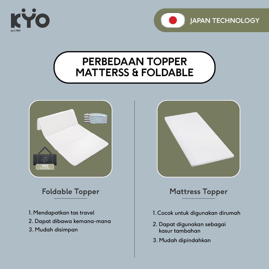 KYO Foldable Mattress dirancang khusus untuk membuat tidur lebih nyenyak dan berkualitas sehingga membuat bangun tidur lebih segar, mampu menopang tubuh dengan lebih sempurna sehingga mengurangi rasa sakit dan pegal saat tidur. KYO Foldable Mattress menjadi solusi yang sangat baik bagi anda untuk melapisi kasur yang sudah tidak nyaman dipakai daripada harus mengganti dengan kasur yang baru, didukung dengan Teknologi Airmate yang membuat kita merasakan tidur di kasur baru. Dengan adanya tas menjadikan KYO Foldable Mattress bisa dibawa kemana saja.
