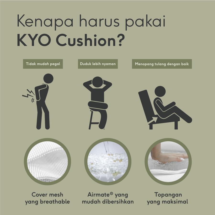 KYO Lucy Seat Cushion dirancang khusus untuk membuat duduk lebih nyaman dan mengurangi tekanan pada tulang belakang terutama saat duduk terlalu lama sehingga tidak mudah pegal. Sangat cocok untuk kamu yang suka beraktifitas lama dalam posisi duduk, seperti pekerja kantoran, gamer, maupun saat berkendara dalam waktu yang lama. KYO Lucy Seat Cushion dapat membantu terhindar dari sakit pinggang, pegal, ataupun kelelahan akibat posisi duduk yang tidak benar. KYO Lucy Seat Cushion juga sangat baik digunakan untuk wanita hamil dan orang tua. KYO Lucy Seat Cushion merupakan salah satu koleksi KYO Conscious, dimana seluruh produk dalam koleksi ini terbuat dari Recycled Airmate. Walaupun terbuat dari bahan daur ulang, kalian akan tetap merasakan kebaikan Airmate tanpa mengurangi manfaatnya sama sekali.