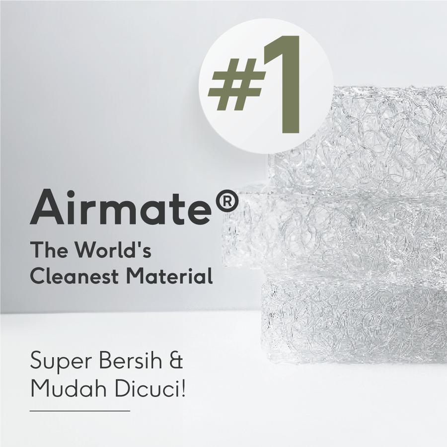 Seluruh produk KYO menggunakan Airmate, inovasi terbaru dari Jepang. Alternatif dari Foam dan Latex, berbentuk untaian tiga dimensi yang 90%-nya adalah udara. Airmate merupakan SATU-SATUNYA material yang dapat dicuci sehingga menjadikan Airmate sebagai alternatif yang TERAMAN dan TERBERSIH di DUNIA.